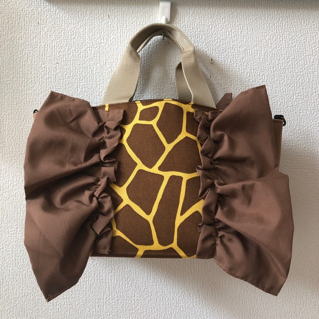 中央:キリン柄ツイル生地(芯貼り) 脇:帆布8号使用 W36(マチ14㎝含む)H18 取っ手30 間口マグネットボタン付き 内ポケット付き ショルダ-を付けるDカン付き 別売りの調整・取り外し可能ショルダ-あります。(500円) バッグ本体綿100% フリルポリエステル100% 取っ手ナイロンテ-プ 取っ手ポリエステル部分のアイロンがけはしないでください フリル部分は当て布をし低温でお願いします。 ※ハンドメイドとなります。ご理解の上ご購入ください